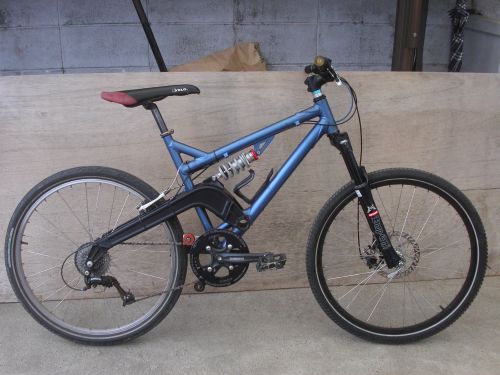 これはフォーズというメーカーのWeaselというフレームで、ダウンヒル競技用のものです。年式としては1990年後半のものなので、もう10年選手ですね。リヤサスのトラベル量についてはちょっと忘れてしまったのですが、120mmほどあるとカタログに書いてあったと思います。でもそんなに動いてはなさそうです。